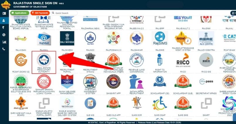 Step 4: Once you log into the SSO portal, you will be landed on the dashboard. Click on "Real Estate Regulatory Authority" (RERA Rajasthan) from the list of options.