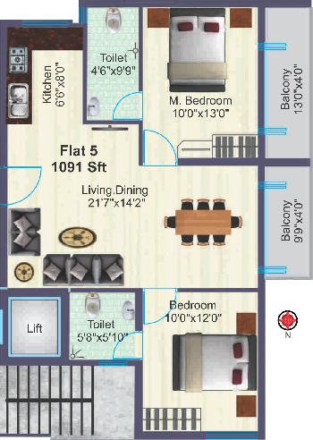 2 BHK+2T | 1091 Sq.ft. (Built Up) |