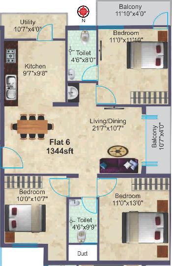 3 BHK+2T | 1344 Sq.ft. (Built Up) |