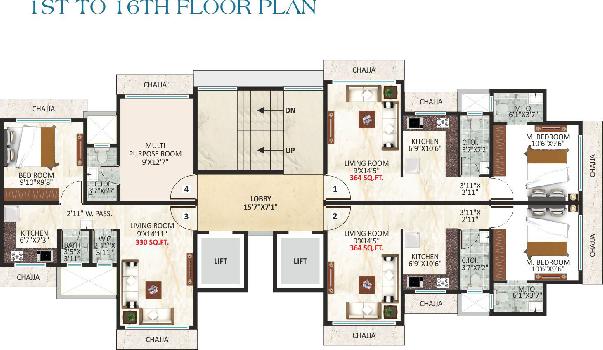The approximate size of a 1 BHK apartment here are 341 Sq.ft., 374 Sq.ft., 386 Sq.ft.