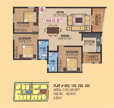 | 3 BHK+2T | 1450 Sq.ft. (Built Up) |