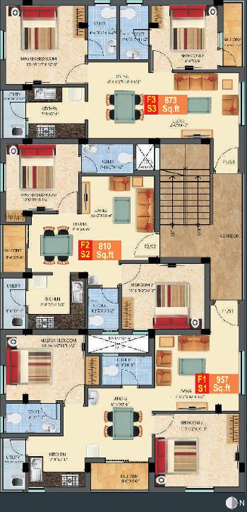 The approximate size of a 2 BHK apartment here are 810 Sq.ft., 873 Sq.ft., 957 Sq.ft.