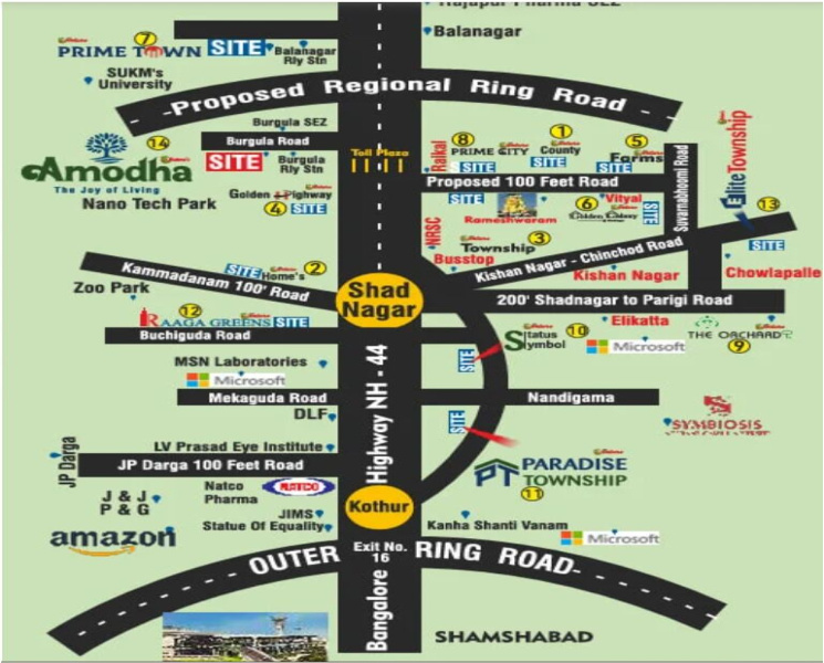 Amodha The Joy of Living is a premium 50-acre residential project by Sunrise Infra Properties Pvt. Ltd., located in Bhurgula, Shadnagar, Hyderabad. This thoughtfully planned development offers a mix of villa plots and open plots, combining modern amenities with a serene, nature-friendly environment. Strategically positioned in a rapidly developing area, Amodha provides excellent connectivity to key infrastructure, making it an ideal choice for both long-term investment and comfortable living.