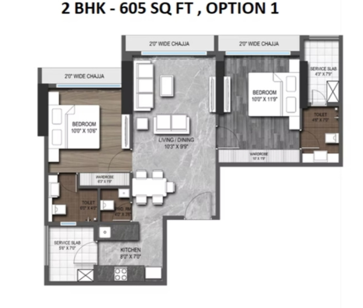 | 2.0 BHK | 603 Sq.ft. (Built Up) |
