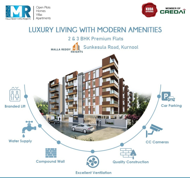 Malla Reddy Infra Projects brings you the exquisite river view apartment; spread over 75 cents, the 67 units nestled in this venture are a gorgeous mixture of elegance and convenience. mr heights is about 10 minutes away from the hyderabad highway. with a host of residential, commercial, educational and entertainment options, and well equipped to provide you with world-class amenities.apartments for sale in kurnool with every attention to details, these apartments are constructed with comforts. mr heights is close to schools, health centers & entertainment centers. with views that soothe your eyes and refresh your soul, come home to contemporary apartments which cater to your every need. malla reddy heights, when dreams comes true.