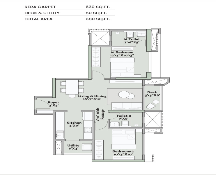 The apartment features 2 spacious bedrooms and 2 modern bathrooms, spread across a carpet area of 680 sq.ft. The property is unfurnished, allowing the new owners to design and decorate the space to their liking. The apartment is well-ventilated and vastu compliant, ensuring a harmonious living environment.