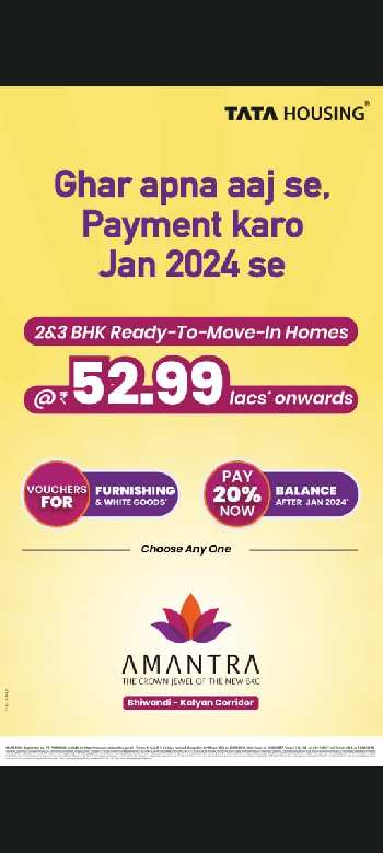 Strategically located, Amantra rises elegantly from the curve of the Bhiwandi Kalyan Corridor as a beacon of style and higher living. The development spread over 20 acres is an inspired blend of urban tranquillity and mode sophistication. With an ensemble of mid and high-rise towers, the tallest soaring 34 storeys, this remarkable residential jewel offers beautifully designed and spacious 2 & 3 bedroom apartments. All elements with elegant landscaping, amenities, specifications and ample podium parking distributed over three levels together make a perfect Abode. The residences integrate well with the surroundings with select homes opening to expansive views of the Ulhas River, sunrise, pastures, the skyline of Thane and the neighbouring Kalyan and Bhiwandi suburbs. ...More