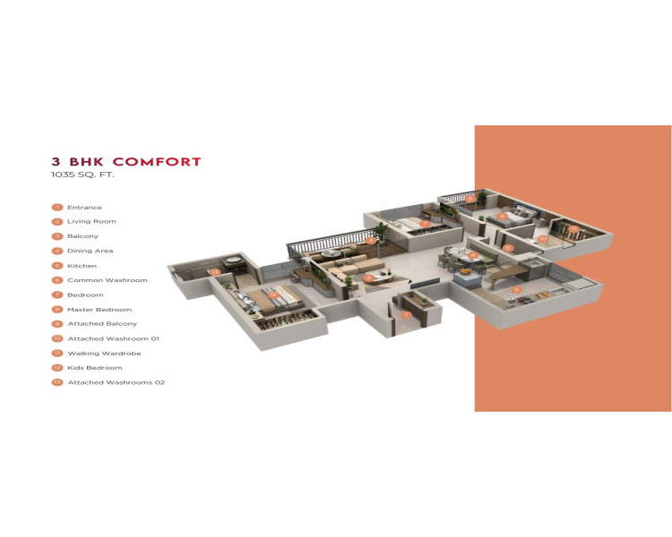 3 BHK Comfort (Walk-in Wardrobe): 1035 sq.ft 1.14 Cr
