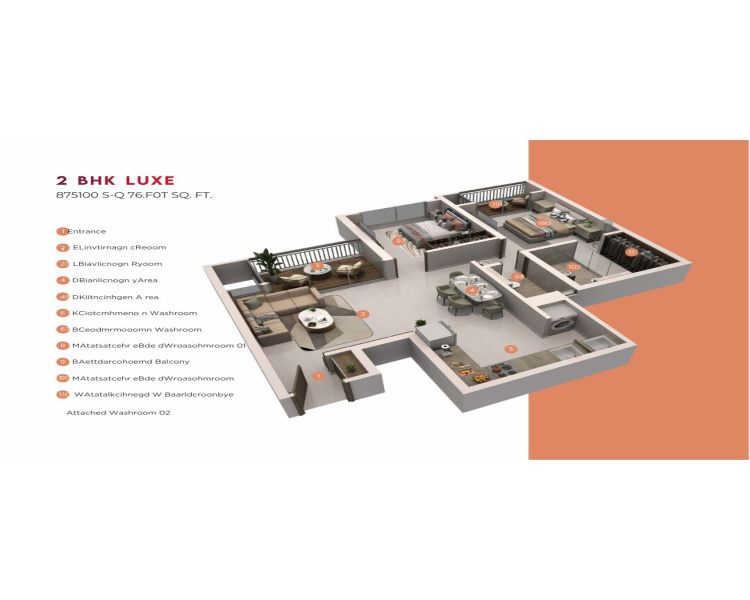 2 BHK Luxe :-810 Sqft 88 L- Double Balcony with Walk-in Wadrobe