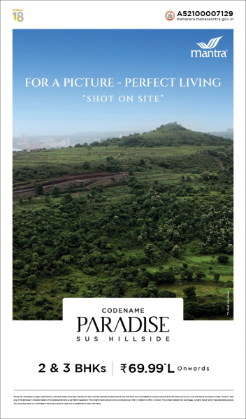 Mantra Codename Paradise, Sus Hillside is an upcoming landmark featuring two magnificent 28-storey towers — the tallest in Sus. Spread across 2.45 acres with stunning hillside views from the South, East, and West, it offers a serene living experience close to nature.We’re beginning this iconic journey with the launch of the first tower, setting the tone for luxury hillside living in Sus.The project presents elegantly planned 2 BHK residences (713.76 sq. ft. Optima & 761.45 sq. ft. Ultima) and spacious 3 BHK residences (945.62 sq. ft.), designed to deliver comfort, style, and modern functionality.Residents can enjoy exclusive M Club amenities such as a gymnasium, yoga and zumba studio, and co-working spaces — creating the perfect balance of wellness, productivity, and leisure. Mantra Codename Paradise truly redefines urban hillside living in Sus. ...More