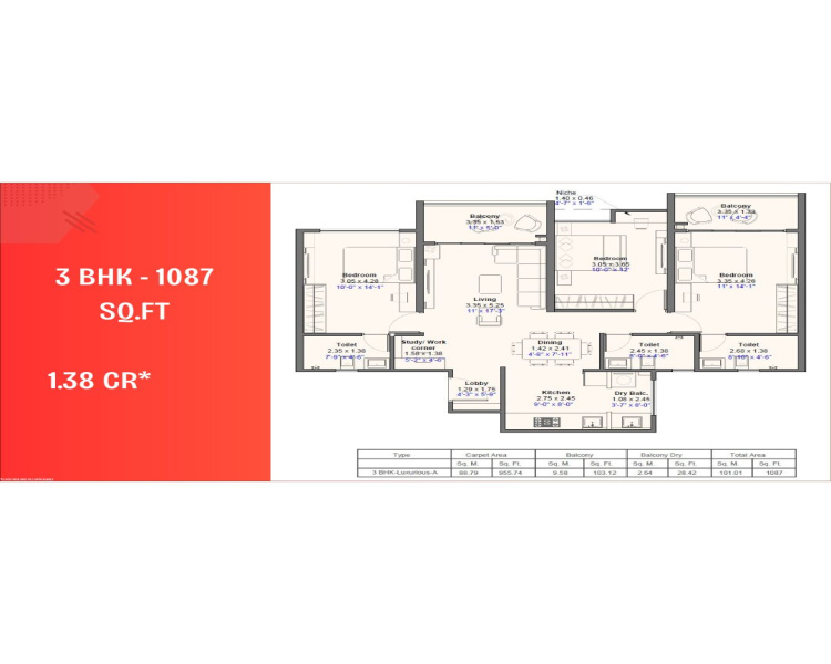 | 3.0 BHK | 1087 Sq.ft. (Built Up) |