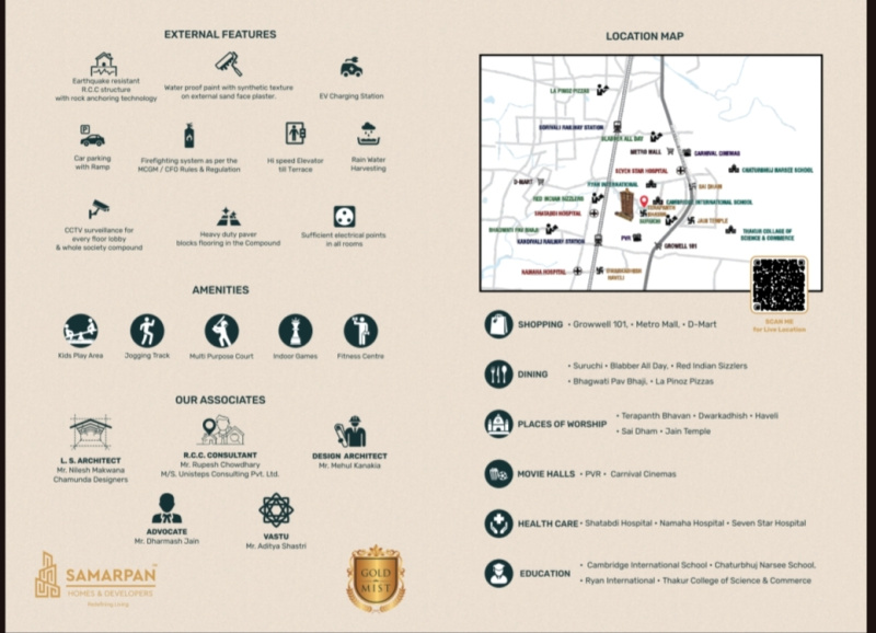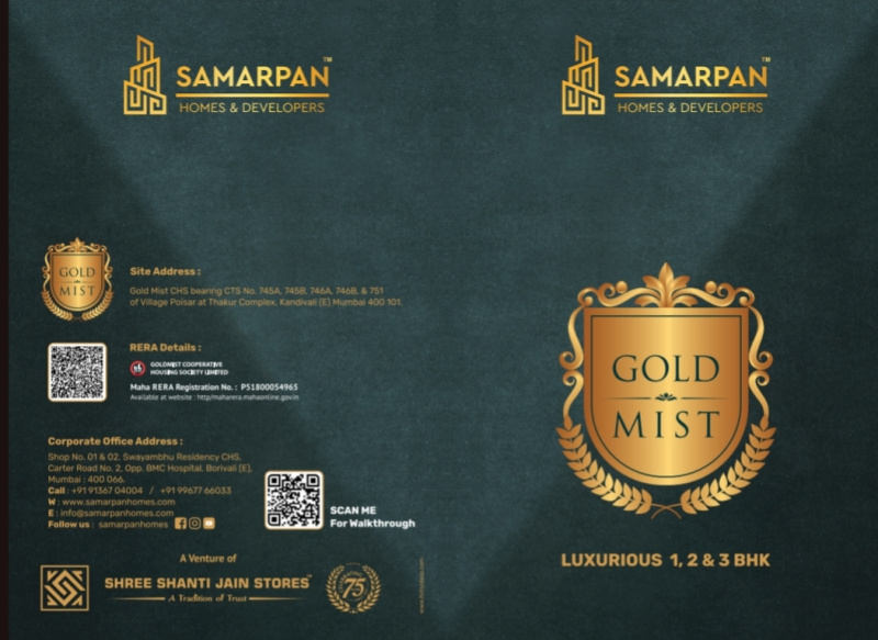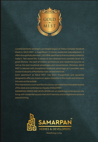 Located perfectly amongst a privileged league at Thakur Village Kandivali (East) is GOLD MIST- a magnificent 19 storey residential redevelopment. It offers thoughtfully planned 1, 2 & 3 BHK apartments that are ideally suited for today's fast-paced life. It places at your disposal every possible facet of a great lifestyle- the best of modern architecture and residential luxuries as well as the best locational advantages and conveniences. Moreover, GOLD MIST is blessed with exceptional locational advantage as it provides easy access to all parts of Mumbai by road, rail and metro rail.Each apartment at GOLD MIST, has been thoughtfully and opulently designed to offer you maximum space utilization in the inside and minimum intrusion on the outside.First impressions count and few structures can match the immediate impact of the sleek and contemporary façade of GOLD MIST.