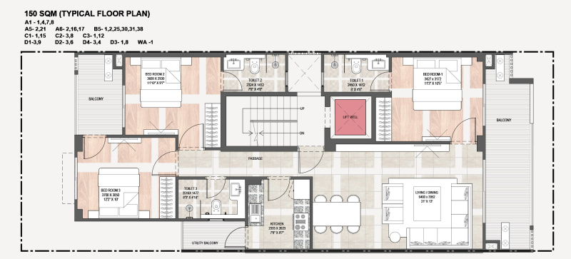 | 3.0 BHK+3T | 1950 Sq.ft. (Built Up) | 750 Sq.ft. (Carpet) |