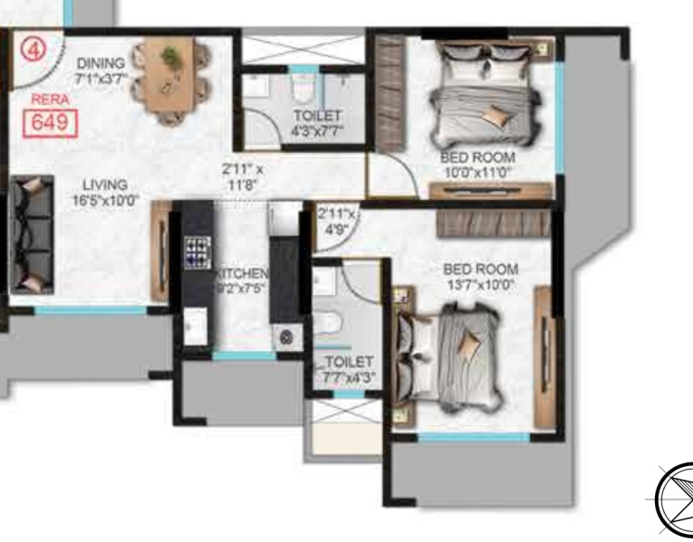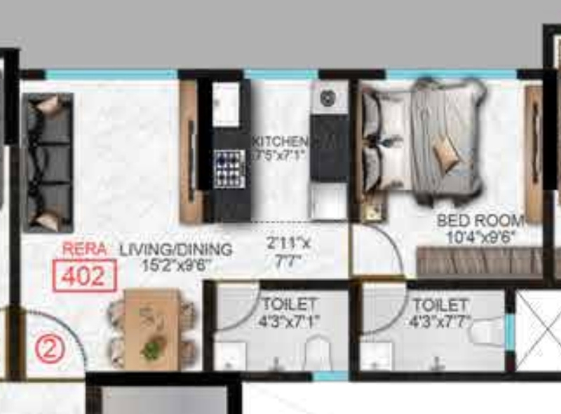 | 2.0 BHK+2T | 1069 Sq.ft. (Super) |