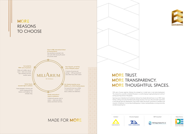 +16 more MILIARIUM is a Eeshanya infra project.located at kolluru.HMDA and RERA approved project. 2.5 acars land 290 flats.only 3bhk and 4bhk flats.15floors plus top side 2floors villas....80000sft place Club house with all amenities......
