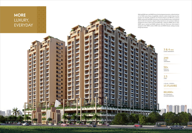 +15 more MILIARIUM is a Gated Comunity apartment flats. HMDA & RERA Approved Project. 15 plus 2floors sky villas.total 299flats.3bhk and 4bhk flats east .west and north face flats available
