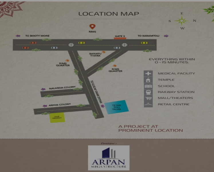 This 3 BHK flat is located in Arpan Vilash, which houses some of the most spacious flats in Morabadi, Ranchi. Constructed on a Super built up area of 1675 sq.ft., the flat comprises 3 bedroom(s), 3 bathrooms and 3 balconies. The flat has a total of 9 floors and this property is situated on 5th floor. Being a ready to move project, you can expect immediate possession of this 1-5 years old property. Arpan Vilash is designed very well to provide modern facilities such as Fitness Centre / GYM, CCTV Surveillance and Lift(s).