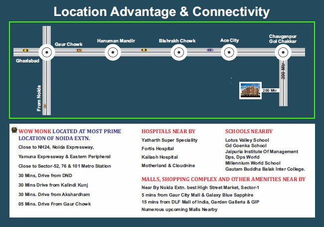 Wow Monk is more than just another residential project in Noida Extension. Developed by Lucky Homes, this low-rise residential community in Khera Choganpur is designed for families who value peace, space and long-term comfort. With beautifully designed 3 BHK and 4 BHK builder floors, Wow Monk offers a balanced lifestyle in one of the fastest growing residential hubs of NCR. With only six towers containing ninety units, the density remains low, creating a peaceful environment where residents know their neighbors, children play safely, and families enjoy true privacy.LOCATION MAP & ADVANTAGE