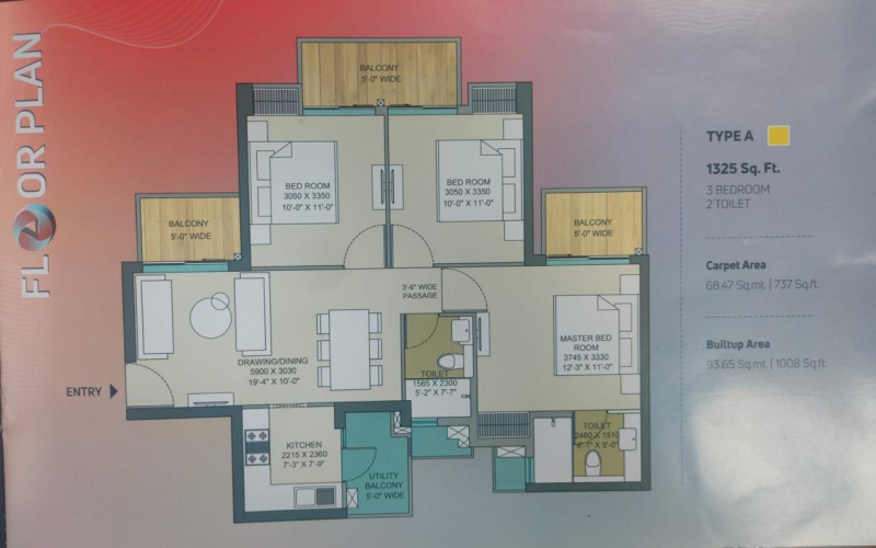 | 3.0 BHK+2T | 1008 Sq.ft. (Built Up) | 737 Sq.ft. (Carpet) | 1325 Sq.ft. (Super) |