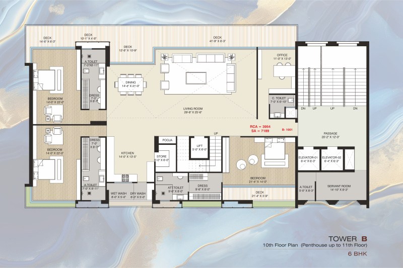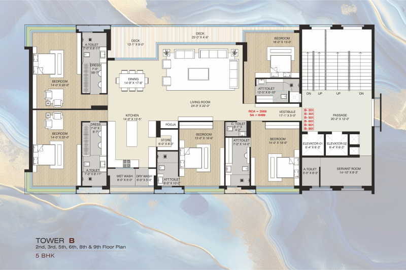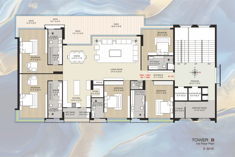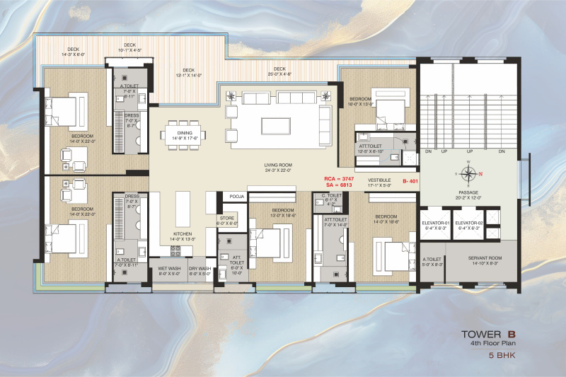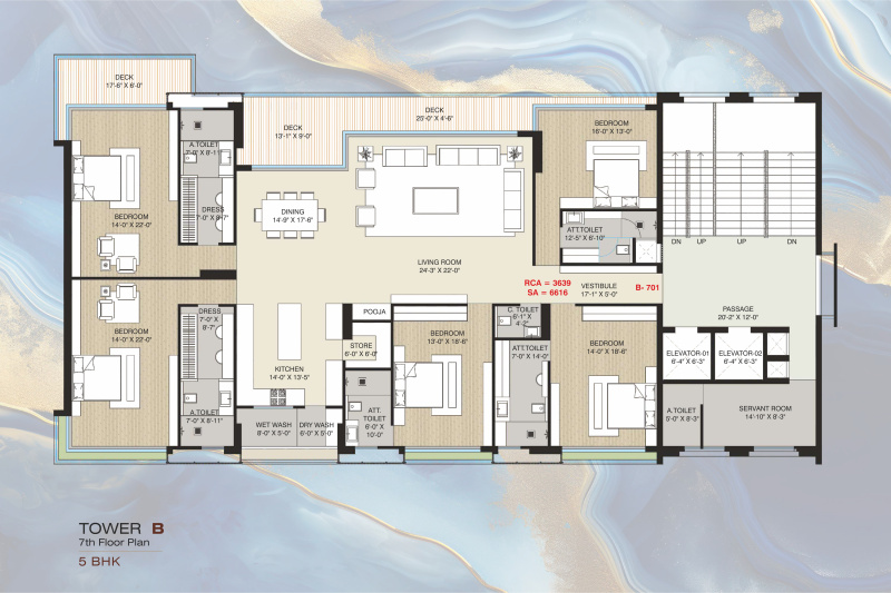 The apartment comes with 5 bedrooms, each with its own attached bathroom, as well as a pooja room, study room, and servant room. The wide and well-maintained roads surrounding the building make it easily accessible, and the gated society provides added security and privacy.
