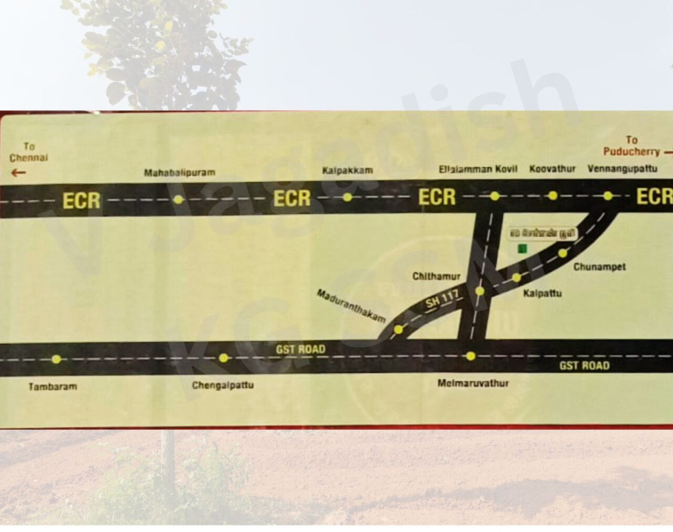 Property Details\\r\\n- Location: ECR (East Coast Road), near Maduranthagam\\r\\n- Size Range: 8140 sq.ft (18.75 cents) - 30,399 sq.ft (69.75 cents)\\r\\n- Price: Ask for Price\\r\\n- Features: Fully fenced, secure gate, drip irrigation system, common guest house, 24/7 security with CCTV cameras, 80 Red Sandalwood trees, variety of fruit trees, free maintenance for 7 years, registration and patta transfer included\\r\\n\\r\\nContact: Jagadish