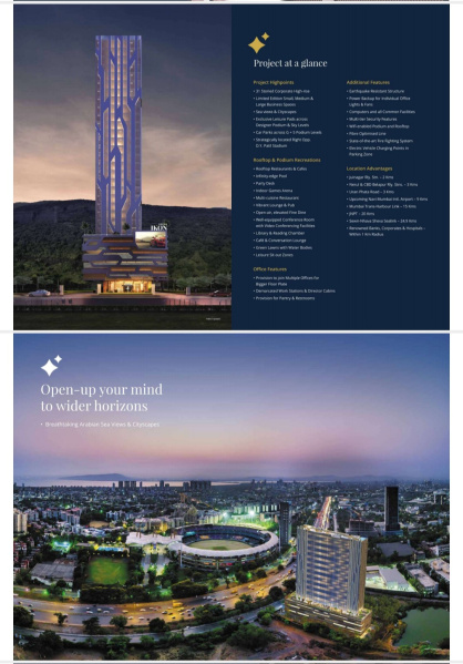 Project Highpoints• 30 Storied Corporate High-rise• Limited Edition Small, Medium & Large Business Spaces• Sea & Cityscapes views• Exclusive Leisure Pads across Designer Podium & Sky Levels• Car Parks across G + 5 Podium Levels• Strategically located Right Opp. D.Y. Patil Stadium ...More