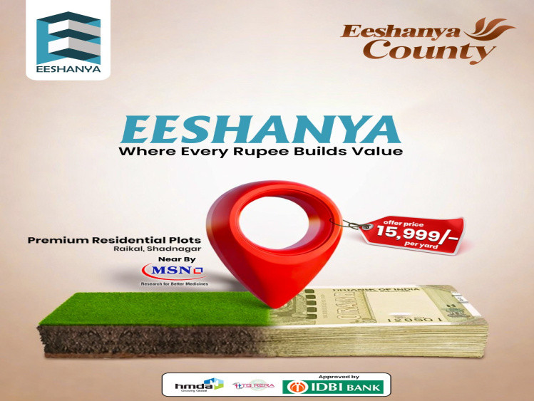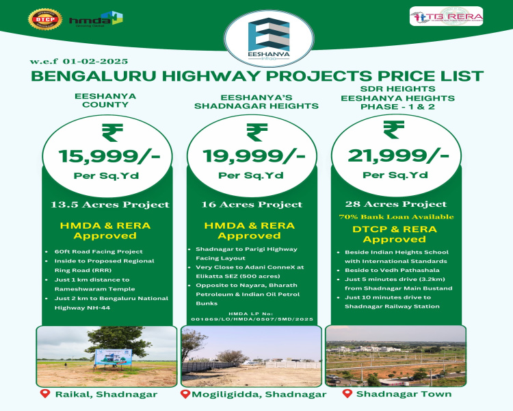 +16 more Eeshanya County project is a HMDA and RERA approved project. 13.5 acars project. Plot sizes 167syrds to 500syrds.16000rs for syrd.2km distance from 2km.1km distance to Rameshwaram temple.60feet road facing project....