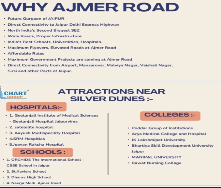 Silver Dunes is an emerging residential plotted development located in Tilaswas (Teelawas), near Mahindra SEZ on Ajmer Road, Jaipur, Rajasthan, India. This area is gaining popularity due to rapid development and excellent connectivity to major hubs.Location & Connectivity