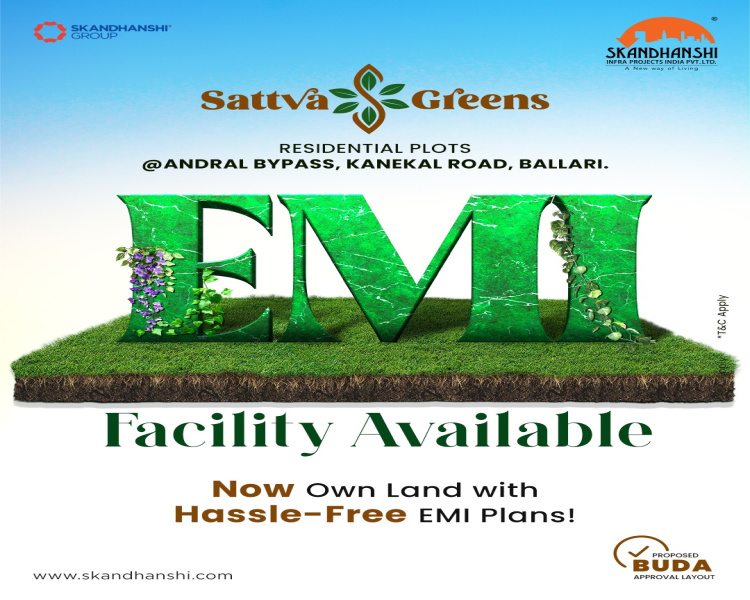 A Natural Choice for a Prosperous Future!Looking to invest in residential plots for sale in Ballari? Welcome to Skandhanshi’s Sattva Greens, a thoughtfully designed community offering premium Ballari plots with excellent infrastructure and modern amenities. Whether you’re planning to build your dream home or seeking a smart land investment, Sattva Greens is the perfect choice.Crafted for comfort and convenience, Sattva Greens features a grand entrance arch, well-laid roads as per norms, and a secure master compound wall. The project ensures a seamless living experience with essential utilities, including electricity with a transformer, an efficient drainage system, and a dedicated water tank facility for an uninterrupted supply. Each plot is equipped with name boards and individual water tap connections, ensuring easy identification and accessibility. Adding to the community’s appeal, avenue plantation enhances greenery, while well-placed streetlights provide safety and visibility throughout.Strategically located, Sattva Greens offers unmatched connectivity to key parts of Ballari, ensuring you’re always well-connected to daily conveniences and essential services. Major landmarks like Kanekal Bus Stand, District Hospital Ballari, Royal Circle, Ballari Railway Station, Ballari Old Bus Stand, and the renowned Sri Durgamma Temple are all within easy reach, making this a location that balances peaceful living with urban access.With the rising demand for residential real estate, investing in Sattva Greens not only secures your future but places you at the heart of Ballari’s growth.Don’t miss the opportunity to buy land in Ballari at Sattva Greens. Discover a space that seamlessly blends comfort, connectivity, nature, and modern infrastructure—your prosperous future begins here. ...More