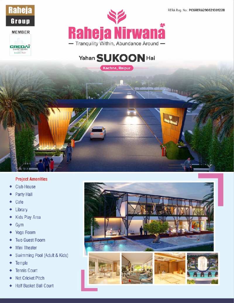 Raheja Nirwana in Kachna is a residential project offering plots by Raheja Group.It is spanned over wide area and is approved by Chattisgarh RERA. The project has all the essential amenities.