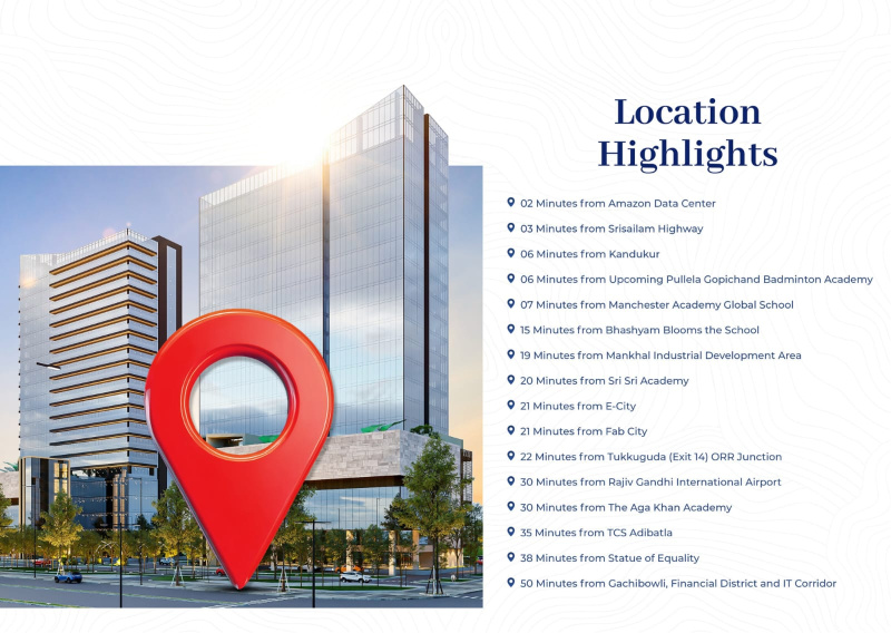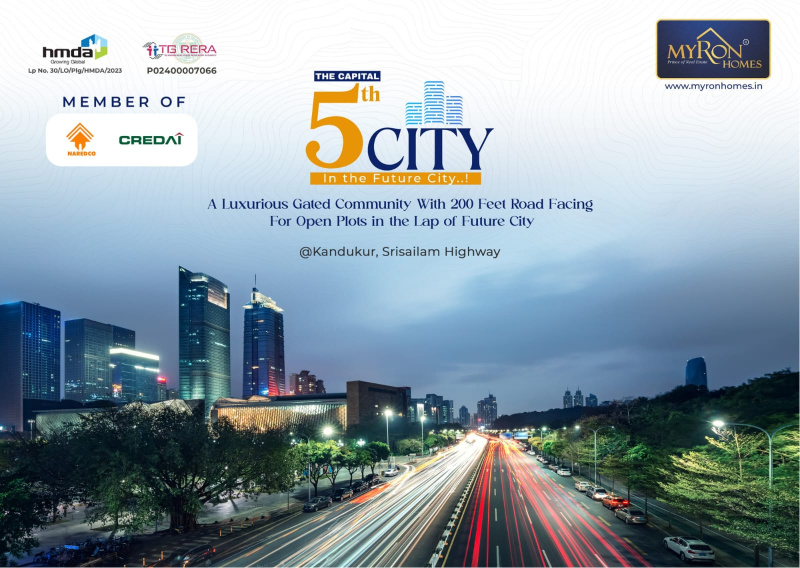 +3 more THE FUTURE OF HYDERABAD IS HERE: MYRON\'S 5TH CITY \r\n\r\nInvest in the heart of the \"Future City\" corridor. Located at Kandukur on the Srisailam Highway, Myrons 5th City is a premium 32.6-acre HMDA & RERA-approved layout designed for those who demand excellence.\r\n\r\n Strategic Location:\r\n\r\n200Ft Road Facing Project.\r\n\r\n02 Mins from Amazon Data Center \r\n\r\n22 Mins from Tukkuguda (ORR Exit 14) \r\n\r\n30 Mins from RGIA Airport \r\n\r\n World-Class Infrastructure:\r\n\r\nHMDA & RERA Approved (P6)\r\n\r\n5,000 Sq. Ft. Designer Clubhouse \r\n\r\n70Ft Wide Access Roads & Underground Utilities \r\n\r\n24/7 Security & Compound Wall Perimeter \r\n\r\nPlot Sizes: Starting from 150 Sq. Yards (403 Plots Total)\r\nDon\'t just buy land; buy a legacy in Hyderabad\'s next big growth hub.