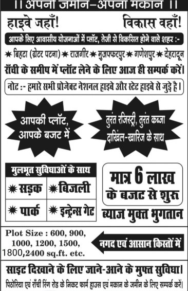 +4 more Saknandu,Kanke 18 Acre Gated Society. Registry-Ready Property\r\n Prime Location:saknandu, Kanke (Ranchi) \r\n Ring Road se sirf 3km , pithoria chowk se 4.5 km near patanjali warehouse \r\n---\r\n Plot Details\r\n- Size: 1000 ,1200,1400,1600 sqft. Best idel for 2BHK/3BHK + Parking + Garden\r\n---\r\n Road & Booking Status\r\n- Village Road: 20ft wide (under planning) \r\n- Main Plotting Road: 30 ft wide \r\n- Internal Roads: 25\'20ft wide \r\n- Total Plots: 274 only \r\n- 10 Booked Today Limited inventory left!\r\n---\r\n Nearby Landmarks\r\n- Ring Road 3km \r\n- NH-33 2.5 km \r\n- Medanta Hospital 6km \r\n- shradha global public school _1km\r\n- Law College 3km \r\n- Ranchi Station 16km \r\n---\r\n Society Facilities\r\n- Gated boundary + entrance arch \r\n- Electricity connection \r\n- On-site Mandir \r\n- PCC Roads + Drainage \r\n- Green zone + park planning \r\n- CCTV surveillance \r\n- General Jamin Registry-ready papers\r\n---\r\n Pricing & Booking\r\n- Rate: 540000 per Decimal \r\n- Pre-Booking:30% Only \r\n- Easy EMI Options\r\nEMI available with no interest for\r\ngenuine buyers\r\n Freehold Property \r\n Clear Legal Lineage \r\n Bank Loan Possible\r\n---\r\n Contact: \r\nIshwar kumar \r\n free Site visit, layout map & booking assistance available\r\n#Ranchijharkhand #ranchiupdates #residentialplots #ranchihomes #residentialplotsforsale #propertiesinranchi #ranchirealestats #jharkhandproperties #plotsforsale #ranchiproperty #ranchihouseing #investinranchi #landforsale #propertyinranchi #ranchidevelopment #nearme #jharkhandrealstate #ranchirealestats \r\n@highlight\r\n:Here are the benefits of buying a plot in a well-developed society or gated colony in Pithoria, Ranchi Side:\r\n\r\n1. *Basic Amenities*: Wide paved roads, electricity, water, drainage system and streetlights are already there.\r\n2. *Security*: Gated entry, security guards and CCTV