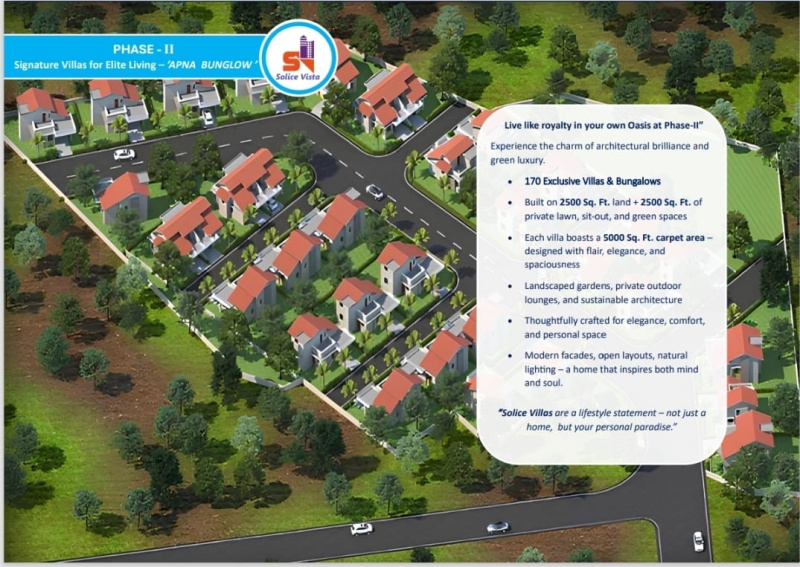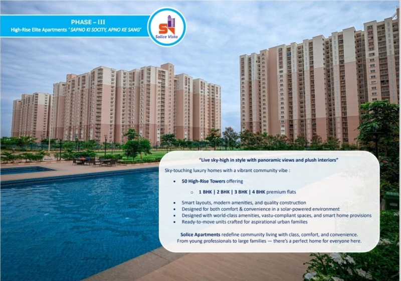 Solice Vista The Future of Eco-Luxury Living\r\n\r\nWelcome to Solice Vista, a thoughtfully planned township that redefines modern, sustainable, and luxurious living. Designed to offer a perfect balance of nature, comfort, and connectivity, Solice Vista is an ideal destination for families, professionals, and investors alike.\r\n\r\nThe project is developed in three well-planned phases:\r\n\r\nPhase I Healthy Community Living\r\nSurrounded by essential social infrastructure, this phase ensures a comfortable lifestyle with easy access to a hospital zone, university zone, clubhouse, and temple, promoting wellness, education, and community harmony.\r\n\r\nPhase II Exclusive Villas & Bungalows\r\nFeaturing 170 premium villas and bungalows, each unit is built on 2500 sq. ft. land with spacious carpet areas. These homes offer private lawns, landscaped gardens, modern faades, open layouts, and abundant natural lightperfect for peaceful and elegant living.\r\n\r\nPhase III High-Rise Apartments\r\nThis phase includes 50 high-rise towers offering 1, 2, 3 & 4 BHK premium flats. The apartments are thoughtfully designed with smart layouts, Vastu-compliant planning, and are ready to move in, ensuring comfort and convenience.\r\n\r\nWorld-Class Amenities & Community Features\r\nResidents can enjoy a wide range of amenities including swimming pools, community halls, open-air gyms, e-library and learning zones, along with 247 smart security, watch towers, and EV charging stations. The project is well-connected to workplaces, prestigious institutions, and modern infrastructure.\r\n\r\nSolice Vista is more than a homeits a lifestyle investment.\r\nInvest in your future. Live the Solice Vista dream.\r\n\r\ncontact us..