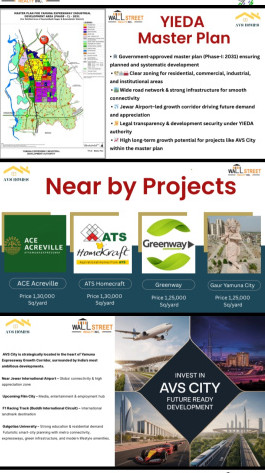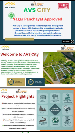 +15 more AVS CITY Premium Residential Plot Project\r\n Yamuna Expressway, Dankaur Greater Noida\r\n Location: Sector 17B, Near Galgotias University, Dankaur, Greater Noida\r\n\r\n Freehold residential plots with excellent future growth\r\n Perfect for end-users & high-return investors\r\n NCR ka fastest developing investment corridor\r\n\r\n Project Area: 34.8 Bigha\r\n Total Plots: 250\r\n Plot Sizes: 100 / 150 / 200 / 250 Sq. Yards\r\n\r\n Fully gated township with modern planning\r\n 30 ft main road 2225 ft internal roads\r\n Park, Temple, Clubhouse, Swimming Pool\r\n CCTV, Electricity, Drainage & Street Lights\r\n G+4 construction approved 2-side open entry\r\n\r\n 3 min from Yamuna Expressway\r\n 1520 min from Jewar International Airport\r\n\r\n Price: 40,000/- per Sq. Yard (Pre-Launch Offer)\r\n Bank Loan Available: 60%70% Bank Approved 70% Marketing Value...