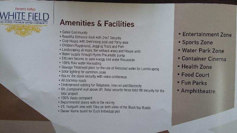 This project located on the highway of tharapurvalsa. Surrounded by many school and hospitals. This is a 120 acers gated community with luxurious amenities. Clubhouse/swimming pool/ party area,Children play ground,Jogging tracks,Landscaping all round,Water supply through hydro pneumatic pump,Sewage treatment plant,Solar lights for common area,Security,Underground cable and drainage,9ft security compound for entire layout,Departmental stores with in vicinity footpath area with tiles on both side