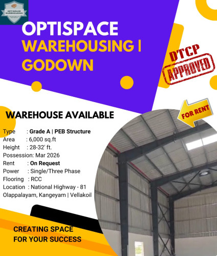 Block #2 of our warehouse construction has been successfully completed and is now ready for possession starting January 2025. This is a prime opportunity to secure a state-of-the-art, DTCP-approved Grade A warehouse tailored to meet your logistics, e-commerce, storage, manufacturing, or OE mill requirements.\\\\r\\\\n\\\\r\\\\nProperty Highlights\\\\r\\\\n Property Type: PEB Structure - Grade A\\\\r\\\\n Property Code: OSWB2\\\\r\\\\n Approval: DTCP Commercial Approved\\\\r\\\\n Build Area: 6,000 sq. ft\\\\r\\\\n Clear Height: 32 ft\\\\r\\\\n Possession: Ready to Occupy [Jan\\\\\\\'2025]\\\\r\\\\n Shutters: 1 x Shutter [20 x 20 ft]\\\\r\\\\n Ramp/Door: Truck Ramp, 1 x Exit Door\\\\r\\\\n Power Supply: Single/3-Phase\\\\r\\\\n Flooring: RCC\\\\r\\\\n Rent: On Request\\\\r\\\\n Location: Kangeyam, Tiruppur (Tier 3 City)...